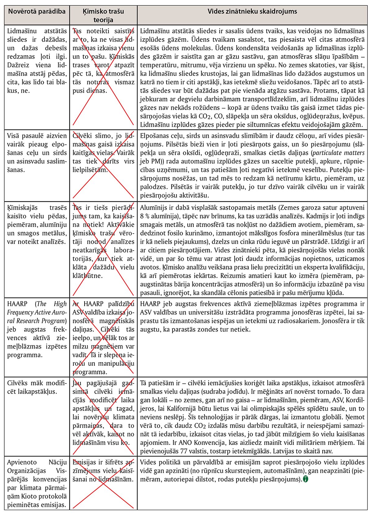Kad «Vides Vēstu» redakcija saņēma lasītājas vēstuli par ķīmiskajām trasēm, apspriedām, rakstīt par tām vai ne, un es iegrimu pārdomās, vai maz vērts tērēt tam laiku. Ierakstot «Google» meklētājā vārdu savienojumu «ķīmiskās trases», parādās vesela rinda avotu latviešu valodā, kas šo lietu nosauc par vislielāko noziegumu pret cilvēci, un tikai viens, kas to uztver kā joku un smejas («Cehs.lv»). Lai gan man patīk humors, nolēmu, ka par šo lietu vērts uzrakstīt nopietni. Iedziļināšanās ķīmisko trašu pētnieku stāstos man radīja ne tikai daudz jautru brīžu, bet arī nopietnas pārdomas par to, kā rodas sazvērestības teorijas un vai tās ir tik nevainīgas, kā pirmajā brīdī šķiet. No vienas puses, apzinos, ka tie, kuri šīm teorijām tic, diez vai mainīs savu viedokli, izlasījuši šo rakstu. No otras puses, iedziļināšanās konkrētajā «sazvērestības teorijā» palīdz saprast arī citas, līdzīgas teorijas. Tāpēc šis raksts būs ne vien par ķīmiskajām trasēm, bet arī veidu, kā šādas teorijas izplatās un kļūst dzīvotspējīgas.